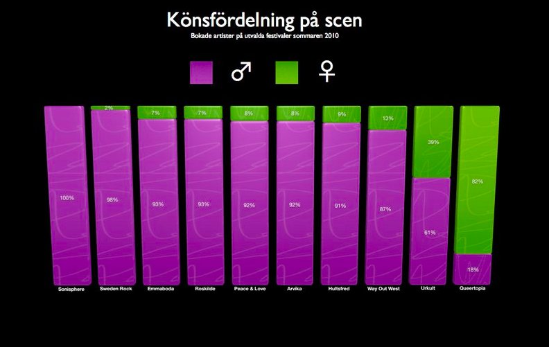 Hörru lilla tolvåring som skriver så otrevliga kommentarer, tagga ner lite va. Om du nu inte tycker att konst skall påverkas av kön så borde du ju kanske tycka att det är konstigt att en så extrem majoritet av de som uppträder på festivalerna är män, trots att det finns sjukt mycket tjejer som håller på med musik också. Det går ju att problematisera varför det är så, eller är vi äckliga då?